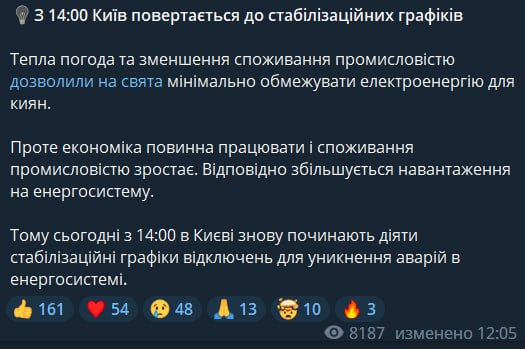 «Сегодня Киев вернулся к стабилизационным графикам. Теплая погода и выходные на производствах и бизнесах позволили провести праздники практически без отключений. Но сейчас все возвращаются…