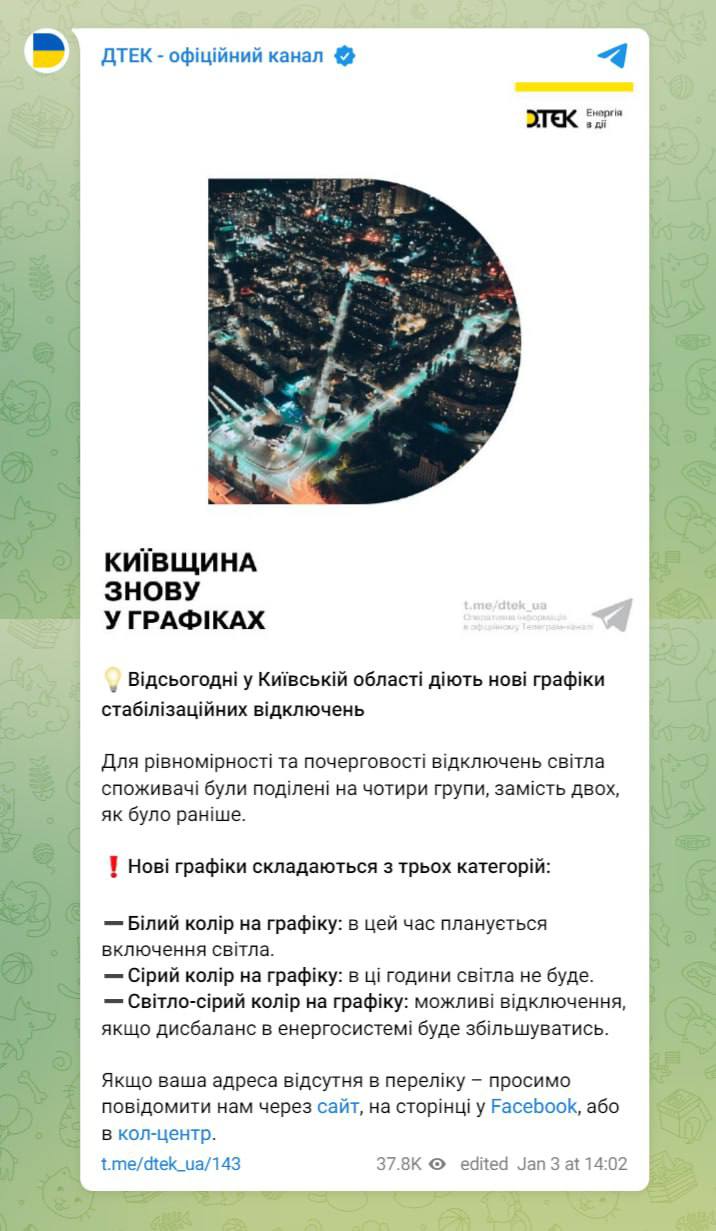 14.35 В Киевской области с сегодняшнего дня начинают действовать новые графики отключений света, сообщает ДТЭК.
