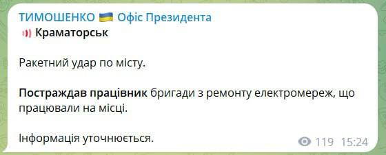 Сообщают о новом ударе по Краматорску, пострадала бригада электриков