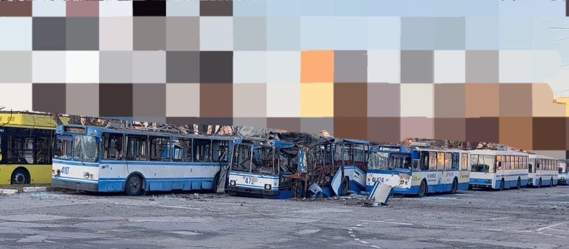 В Херсоне коммунальное предприятие "Херсонэлектротранс" пострадало от обстрела РФ. Есть серьезное попадание в троллейбус, повреждены две единицы транспорта рядом.