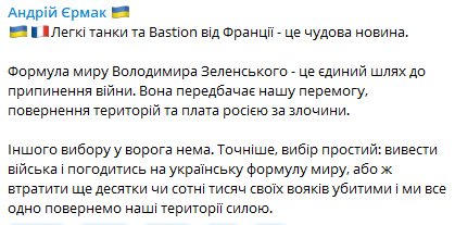 19.29 Глава Офиса президента Андрей Ермак подтвердил, что Франция поставит ВСУ бронеавтомобили Bastion.