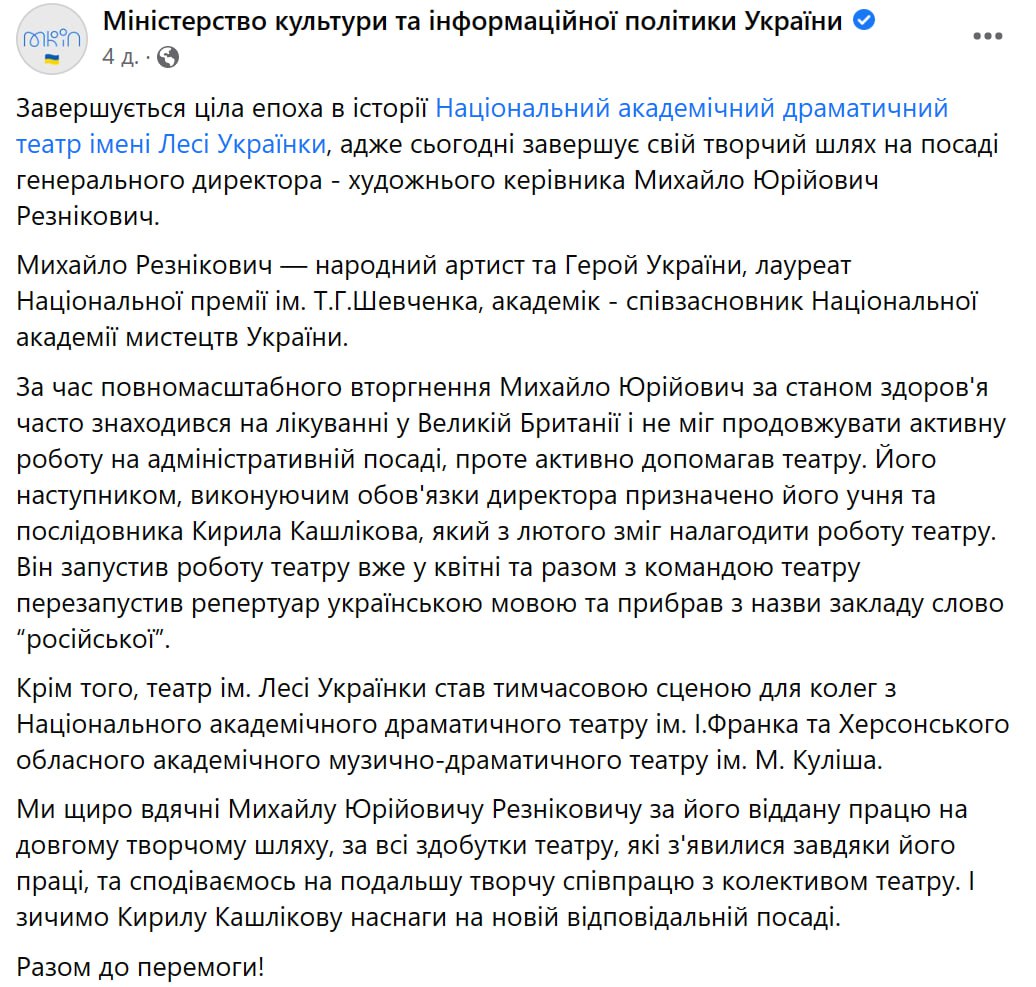 "Он запустил работу театра уже в апреле и вместе с командой театра перезапустил репертуар на украинском языке и убрал из названия заведения слово "русский"", - перечисляет достоинства нового руководителя Минкульт.