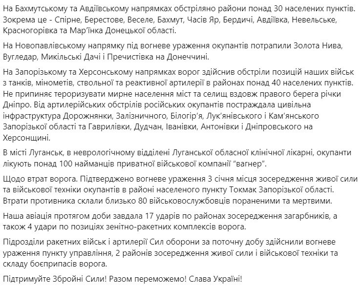 2. За минувшие сутки подразделения Сил обороны Украины отразили атаки россиян в районах населенных пунктов Стельмаховка и Белогоровка Луганской области и Соледар, Красная Гора, Бахмут, Майорск, Марьинка, Новомихайловка, Победа и Красногоровка Донецкой области.