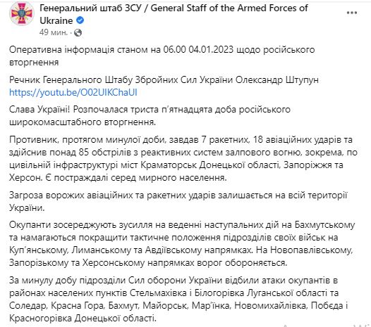 Утром 4 января Генштаб ВСУ обнародовал ежедневную сводку о ситуации на фронте.