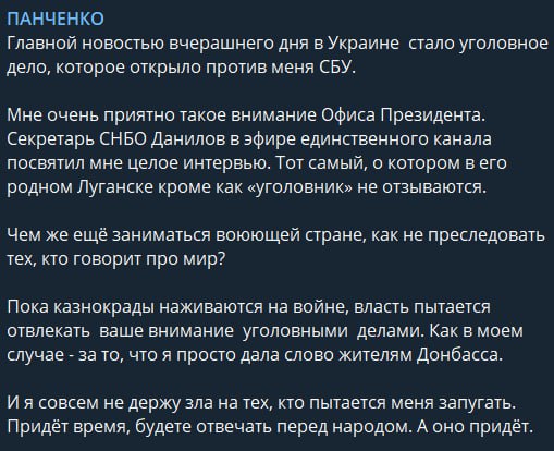 Панченко заявила, что такое внимание для нее "очень приятно". По ее словам, она "просто дала слово жителям Донбасса" и говорила о мире.