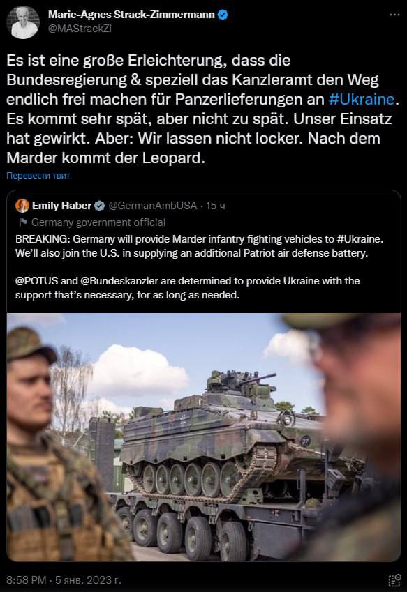 13.00 Председатель оборонного комитета Бундестага Агнес Штрак-Циммерманн приветствовала решение федерального правительства Германии поставить Украине бронетранспортеры Marder и предположила, что следующей поставкой станут танки Leopard.