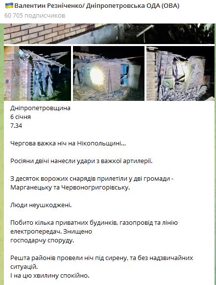 07.45 Ночью 6 января россияне дважды нанесли удары из тяжелой артиллерии по Днепропетровской области.