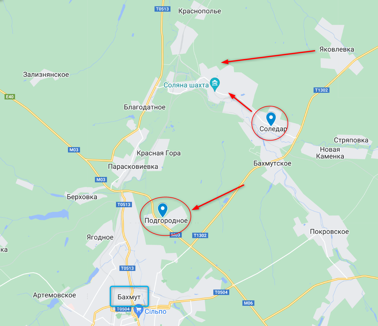 Также явно видны попытки россиян окружить Соледар и заблокировать имеющийся там украинский гарнизон. Как уже упоминалось, Генштаб ВСУ подтвердил слухи о боях, которые ведутся к к северо-западу от Соледара, в районе станции Соль. Атаки россиян там, по данным Генштаба, отражены. Ранее россияне заявляли, что атакуют в районе населённого пункта Краснополье около Соли.