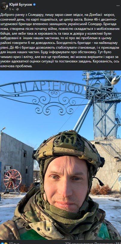 Главред сайта "Цензор" Юрий Бутусов разместил в Фейсбуке свое фото на фоне ворот "Артемсоли" и написал, что находится в центре города и что "воины 46-й десантно-штурмовой бригады уверенно защищают украинский Соледар". Также он написал, что украинские войска контролируют 95% Соледара.