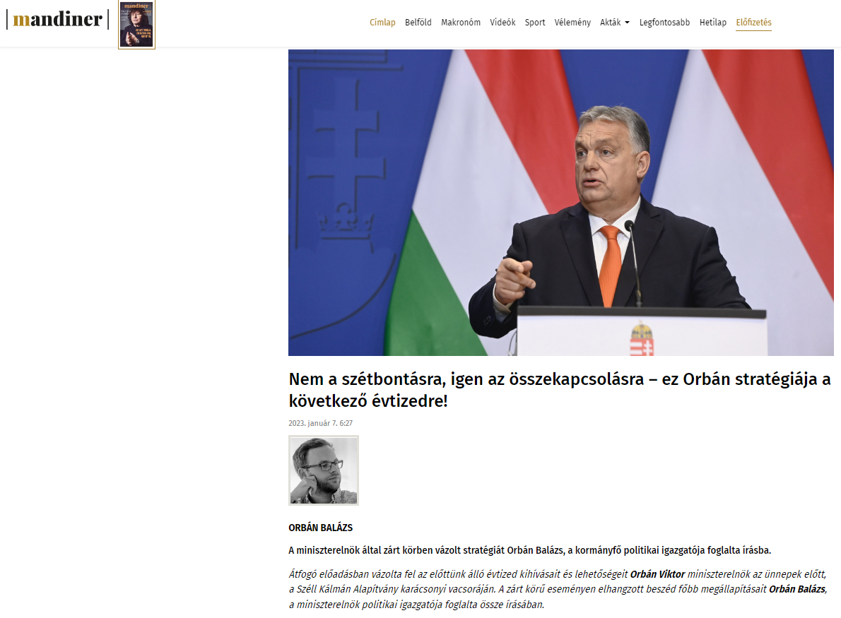 Об этом Орбан заявил в своей в речи на рождественском ужине Фонда имени Селла Калмана (венгерского политического деятеля конца XIX - начала ХХ века), тезисы которой изложил его политический советник Балаш Орбан в статье для издания Mandiner.