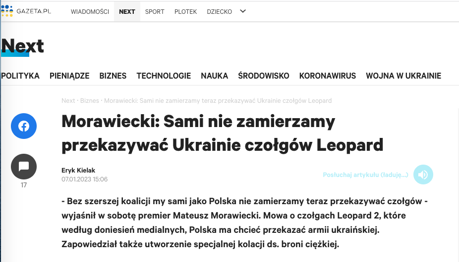 "Мы сами не собираемся передавать свои танки. Без более широкой коалиции Польша сама по себе не собирается сейчас передавать эти танки", - сказал он на пресс-конференции.