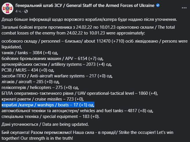 В утренней сводке Генштаба без деталей говорилось о том, что за прошедшие сутки Силы обороны потопили одно военное судно РФ.