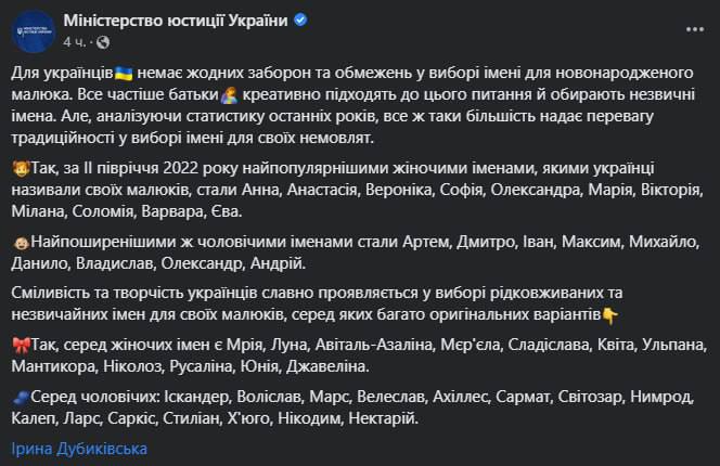 Министерство юстиции Украины выпустило отчёт о том, какими именами украинцы называли своих детей в 2022-м году.