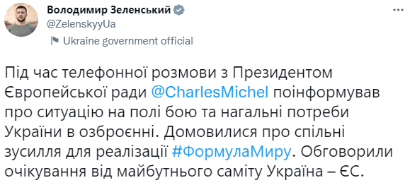 "Во время телефонного разговора с президентом Европейского совета Шарлем Мишелем проинформировал его о ситуации на поле боя и насущных нуждах Украины в вооружении. Договорились о совместных усилиях по реализации Формулы Мира. Обсудили ожидания от предстоящего саммита Украина-ЕС", - сообщил Зеленский.