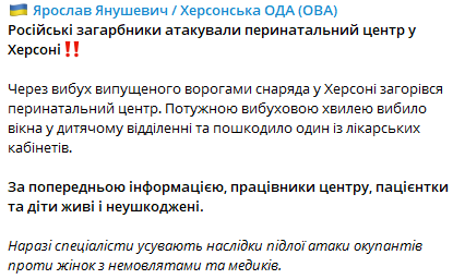 По данным Минздрава, в результате обстрела пострадало здание Херсонского городского перинатального центра 2 уровня им. Клименко.
