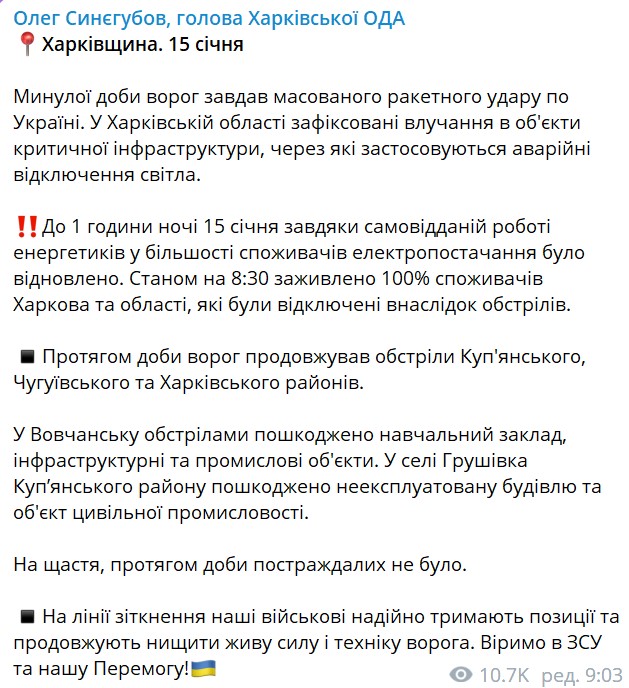 10:00 В Харькове и области по состоянию на это утро к электропитанию подключены 100% потребителей. Об этом заявил губернатор Олег Синегубов.