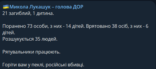"Ранены 73 человека, из них - 14 детей. Спасены 38 человек, из них – 6 детей. Разыскивается 35 человек. Спасатели работают", - написал Лукашук.