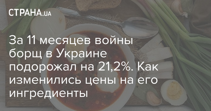 Стоимость борща в Украине выросла на 21,2% за 11 месяцев войны. По состоянию на 13 января 2023 года порция борща на четырех человек, приготовленная по традиционному рецепту, обойдется в 99,2 грн, тогда как 24 февраля 2022 года она стоила 81,84 грн.