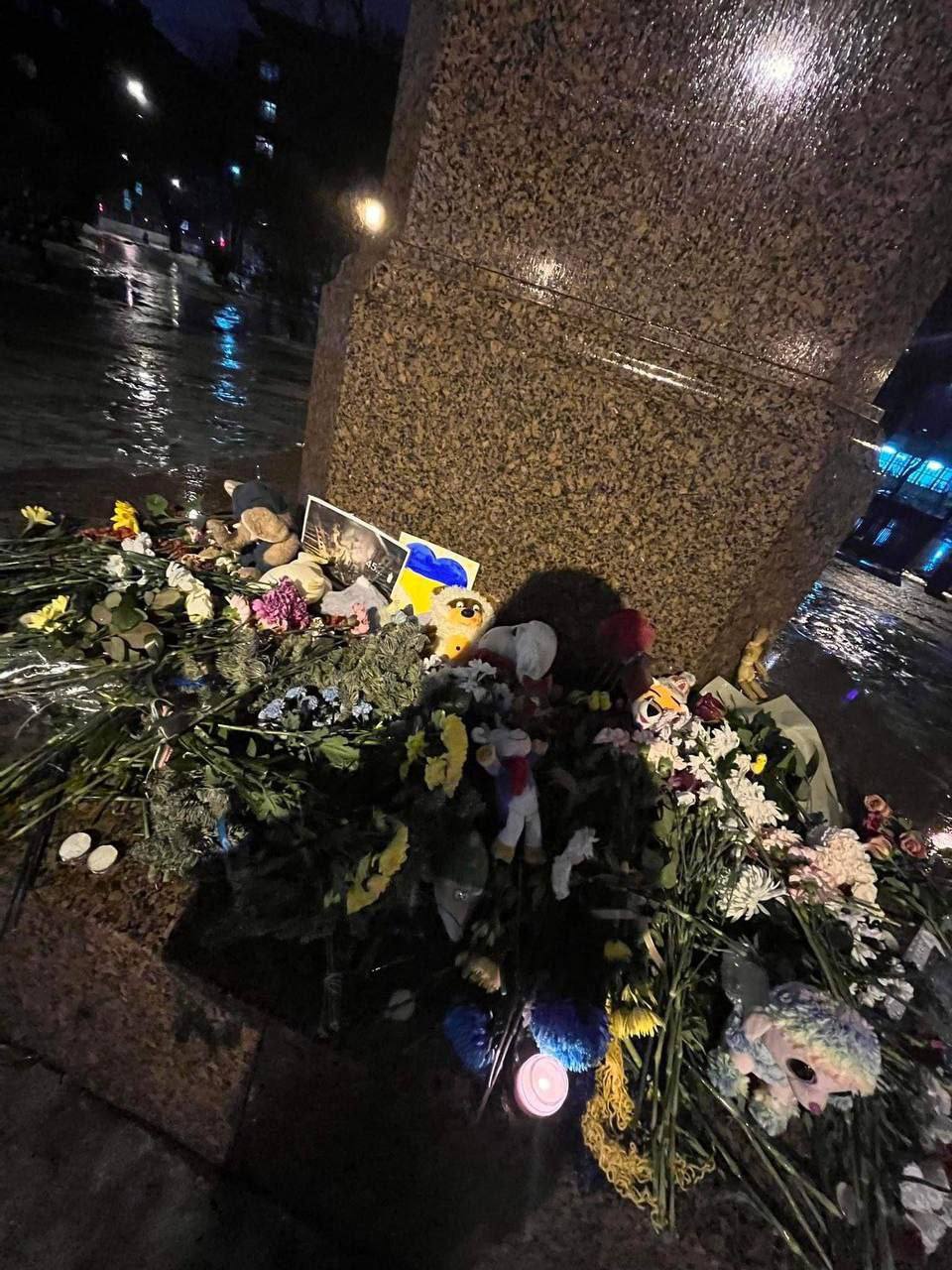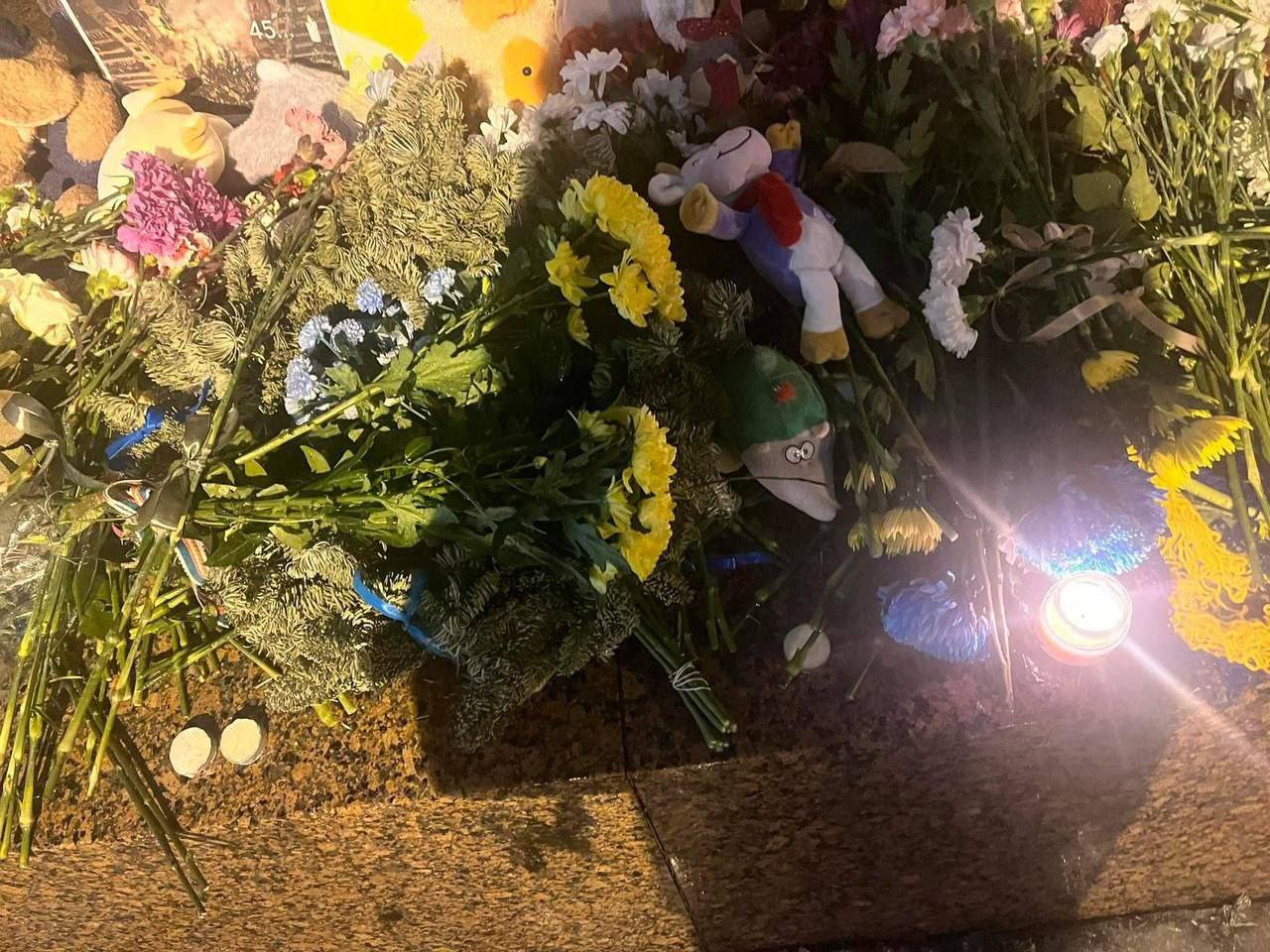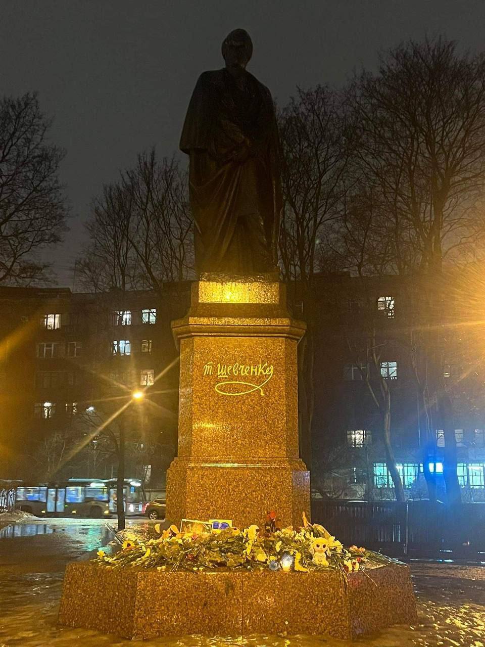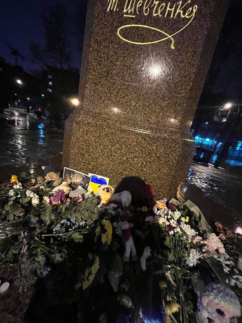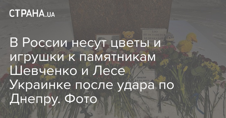 К памятнику Тарасу Шевченко в Санкт-Петербурге и к памятнику Лесе Украинке в Москве после удара по жилому дому в Днепре люди несут цветы и детские игрушки.
