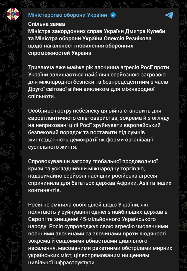 Заявление обнародовано в телеграм-канале Минобороны Украины.