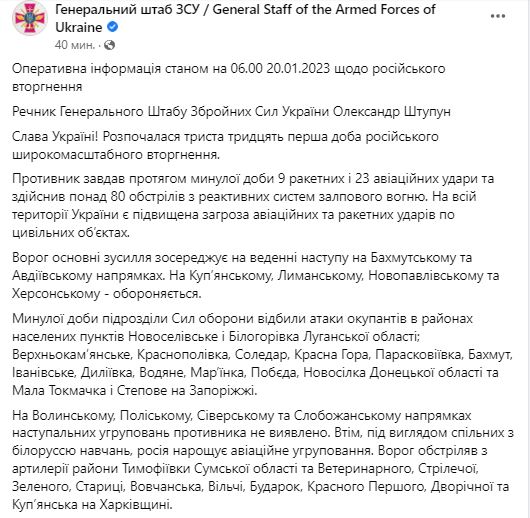 Утром 20 января Генштаб ВСУ обнародовал сводку о ситуации на фронте.