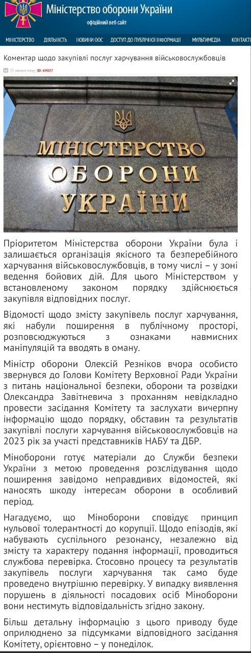 Там говорится также о том, что министр обороны Алексей Резников вчера лично обратился к председателю Комитета Верховной Рады Украины по вопросам национальной безопасности, обороны и разведки Александру Завитневичу с просьбой безотлагательно провести заседание Комитета и заслушать исчерпывающую информацию о закупках, ставших предметом журналистского расследования.