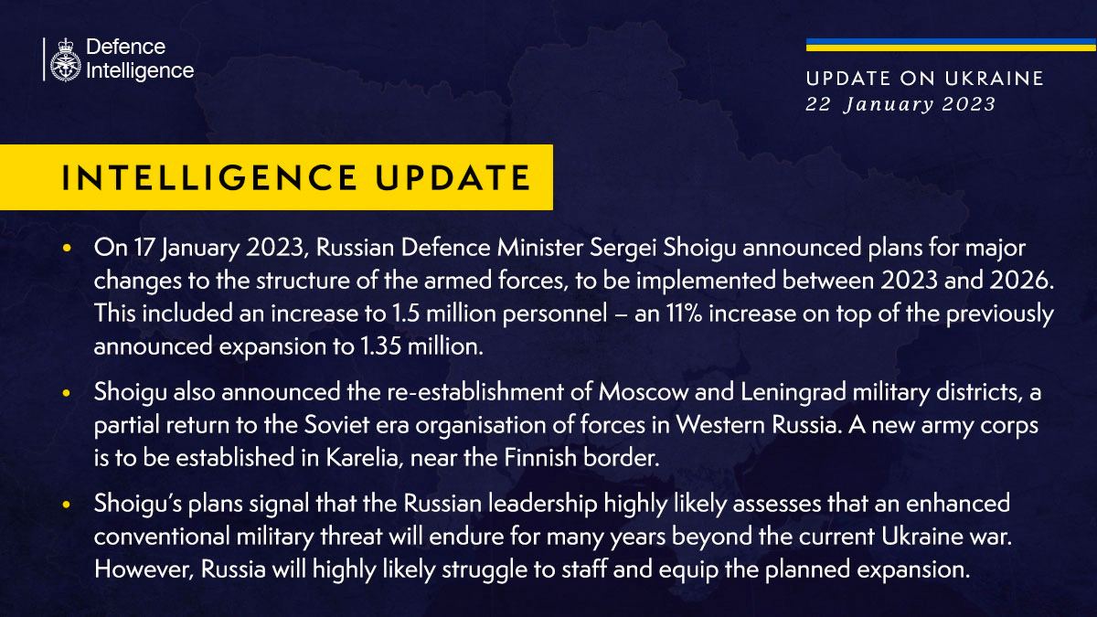 "Планы Шойгу сигнализируют о том, что российское руководство, скорее всего, считает, что усиленная военная угроза с применением обычных вооружений сохранится еще много лет после нынешней войны в Украине. Однако России, скорее всего, будет трудно укомплектовать персонал и оснастить запланированное расширение", - отмечает разведка Британии.