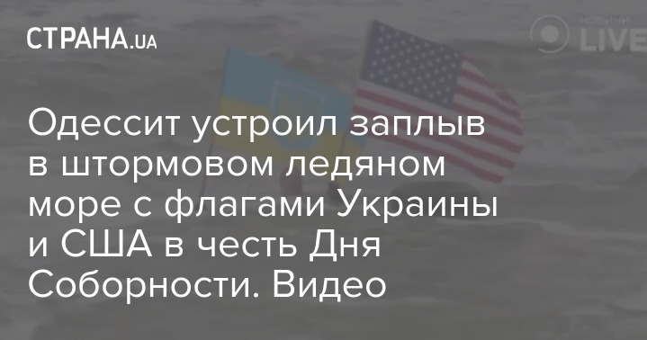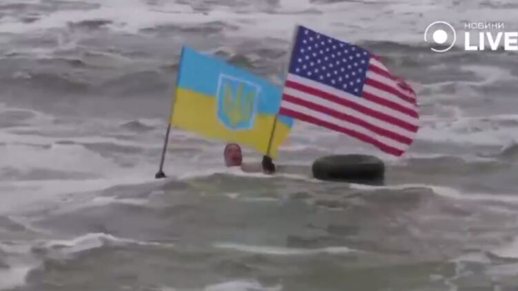 Одессит устроил заплыв в штормовом ледяном море с флагами Украины и США в честь Дня Соборности. Видео