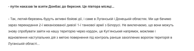 "Февраль-март - будут активные боевые действия, и именно в Луганской и Донецкой областях. Мы еще видим сейчас перекидывание второй механизированной дивизии первой танковой армии из Беларуси. Не исключаем, что они могут снова попытаться зайти на нашу территорию через границу, это Купянское направление, возможно и возобновление наступательных действий с целью возвращения под контроль ранее захваченных врагом территорий в Луганской области", - сказал Скибицкий.