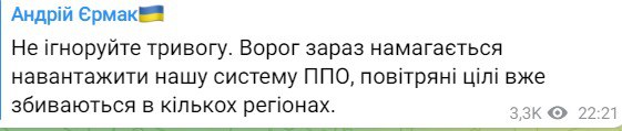 22:23 ПВО работает по воздушным целям в нескольких регионах, сообщил глава Офиса президента Андрей Ермак в своем тг-канале.