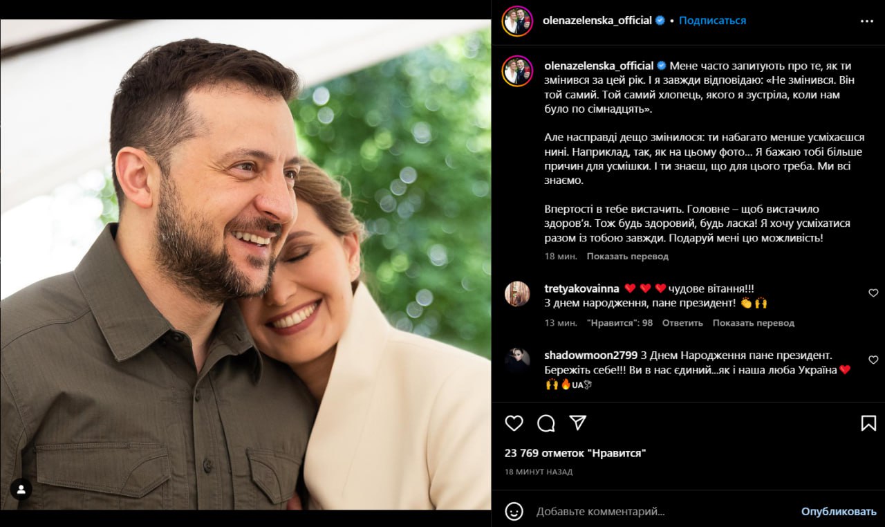 Сегодня, 25 января, президент Украины Владимир Зеленский отмечает 45-летие. Первая леди Украины поздравила мужа и рассказала, как он изменился за этот год.