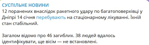 12 человек, которые пострадали в результате ракетного удара по многоэтажке в Днепре, находятся на стационарном лечении. Из них 11 взрослых - девять женщин и двое мужчин, а также один ребенок.