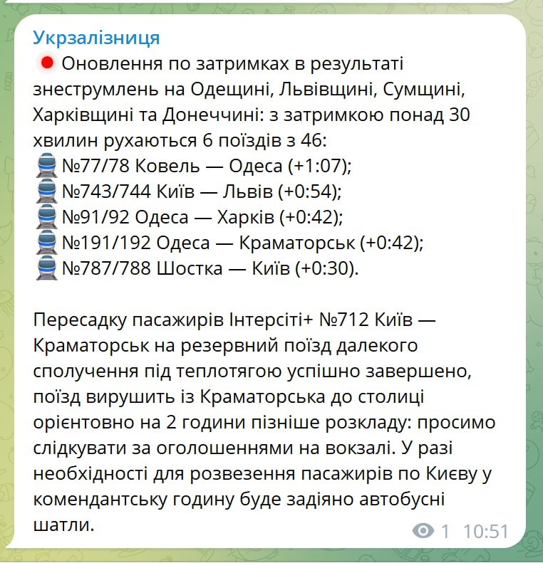 Задержки в результате обесточенных линий наблюдаются в Одесской, Львовской, Сумской, Харьковской областях и на Донбассе. С задержкой более 30 минут следуют 6 поездов из 46: