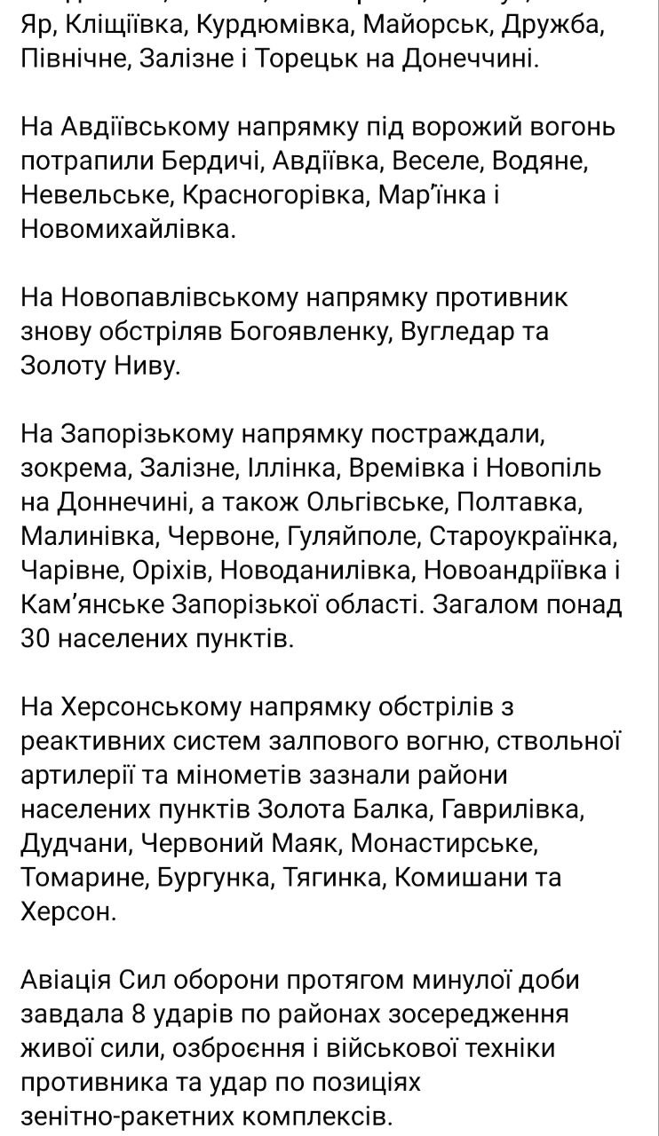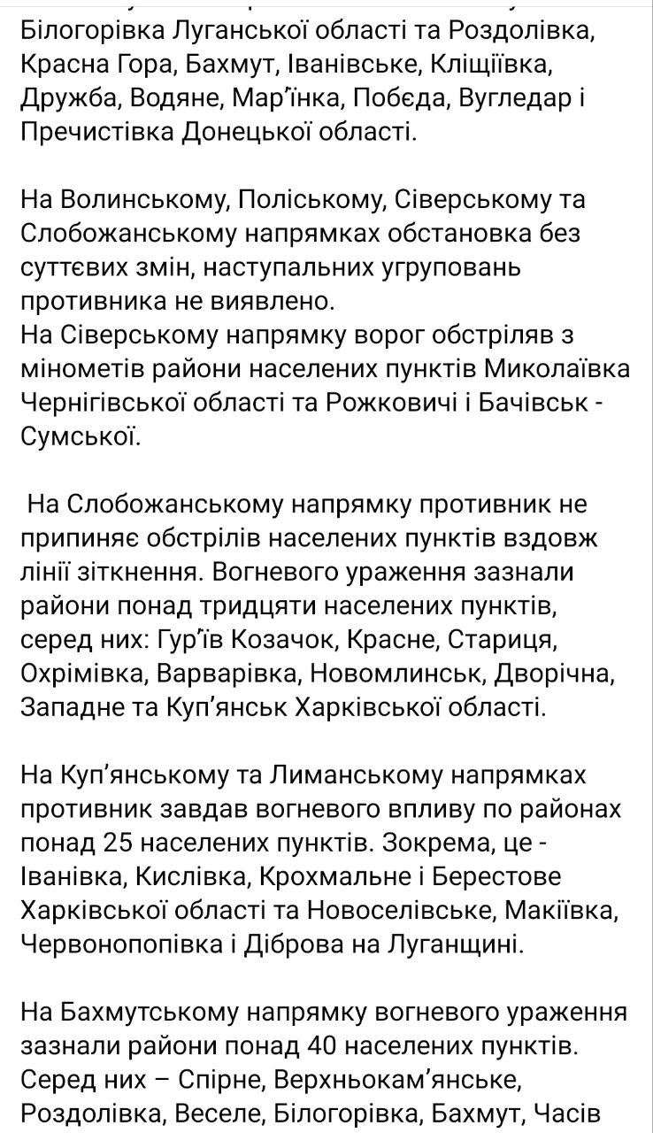 3. Отражены атаки россиян: в Белогоровке Луганской области, в Раздоловке, Красной Горе, Бахмуте, Ивановском (на трассе Бахмут-Константиновка) Клещеевке, Дружбе, Водяном, Марьинке, Победе, Угледаре и Пречистовке Донецкой области.