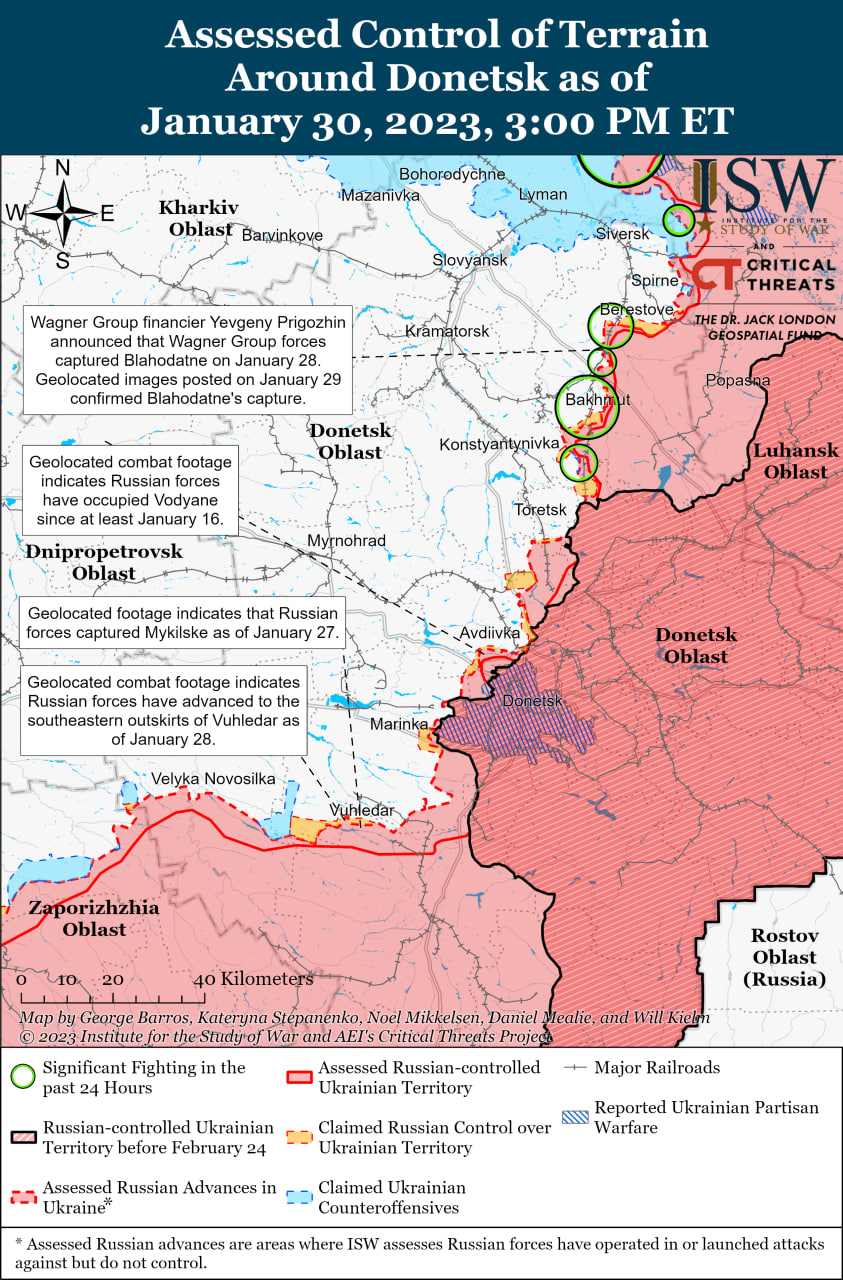 1. Заявление группы "Вагнера" о захвате Благодатного к западу от Соледара подтверждается кадрами с геолокацией от 29 января. Россияне также замечены на трассе Бахмут - Северск южнее Благодатного.