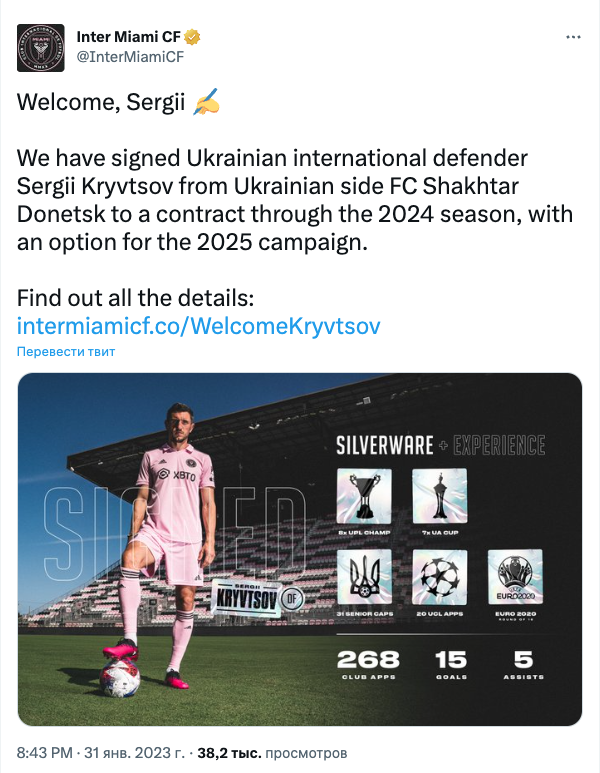 Еще один украинский футболист покидает отечественный чемпионат в это трансферное окно. Центральный защитник "Шахтёра" Сергей Кривцов переходит в американский клуб легендарного футболиста Дэвида Бекхэма "Интер Майами".