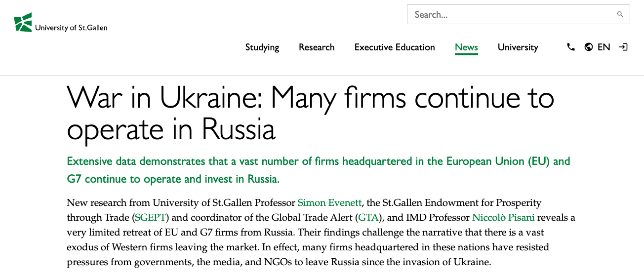 Профессора Саймон Эвенетт и Никколо Пизани отмечают в исследовании, что выходить с рынка России для бизнесов невыгодно.