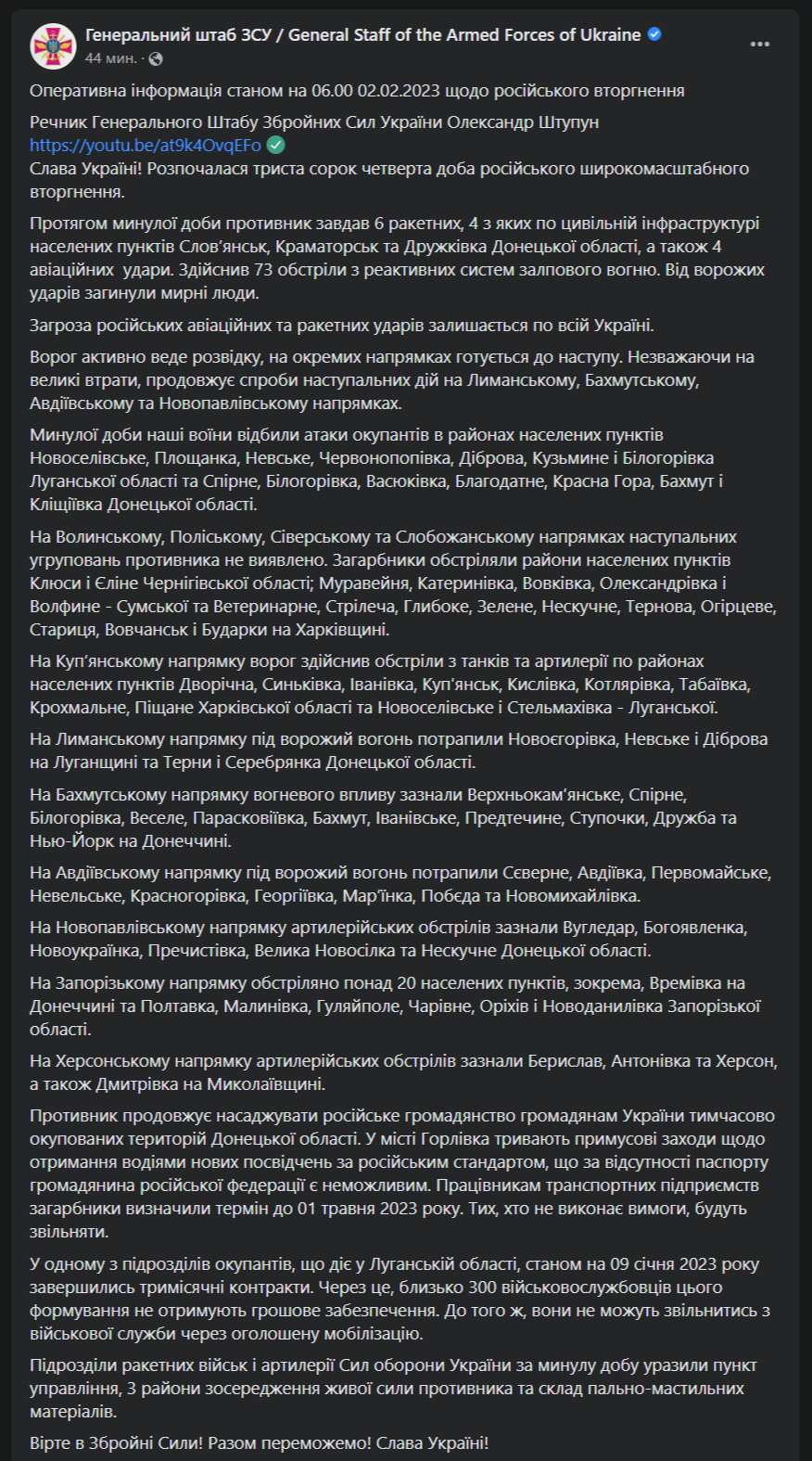 07:15 Сводка украинского Генштаба на утро 2 февраля. Главное: