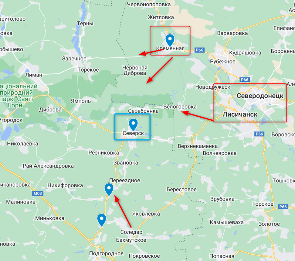 То есть россияне продвигаются от Бахмута к Северску с юга. Учитывая, что одновременно РФ наносит удар к северу от Северска (от Кременной на запад по левому берегу Северского Донца), очевидно, что российские войска стремятся помимо прочего взять в полукольцо подразделения ВСУ, обороняющие Северск и окрестности.