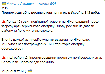В частности, по словам Лукашука, за сутки было более 12 часов воздушной тревоги на Никопольщине из-за угрозы артиллерийских обстрелов.
