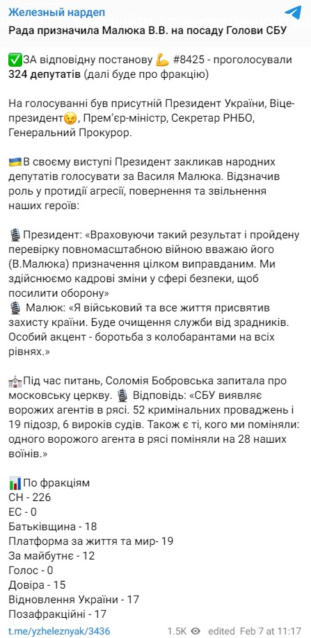 По информации нардепа Ярослава Железняка, за Малюка проголосовало 324 депутата.