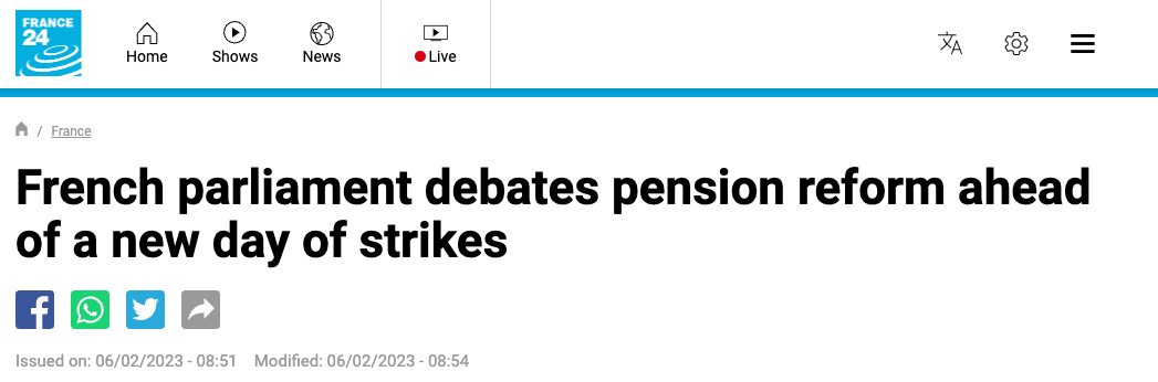 Ранее премьер-министр Франции Элизабет Борн заявляла, что цель реформы - избежать дефицита денег в пенсионном фонде Франции, который к 2030 году, по прогнозам, может достичь 20 млрд евро.