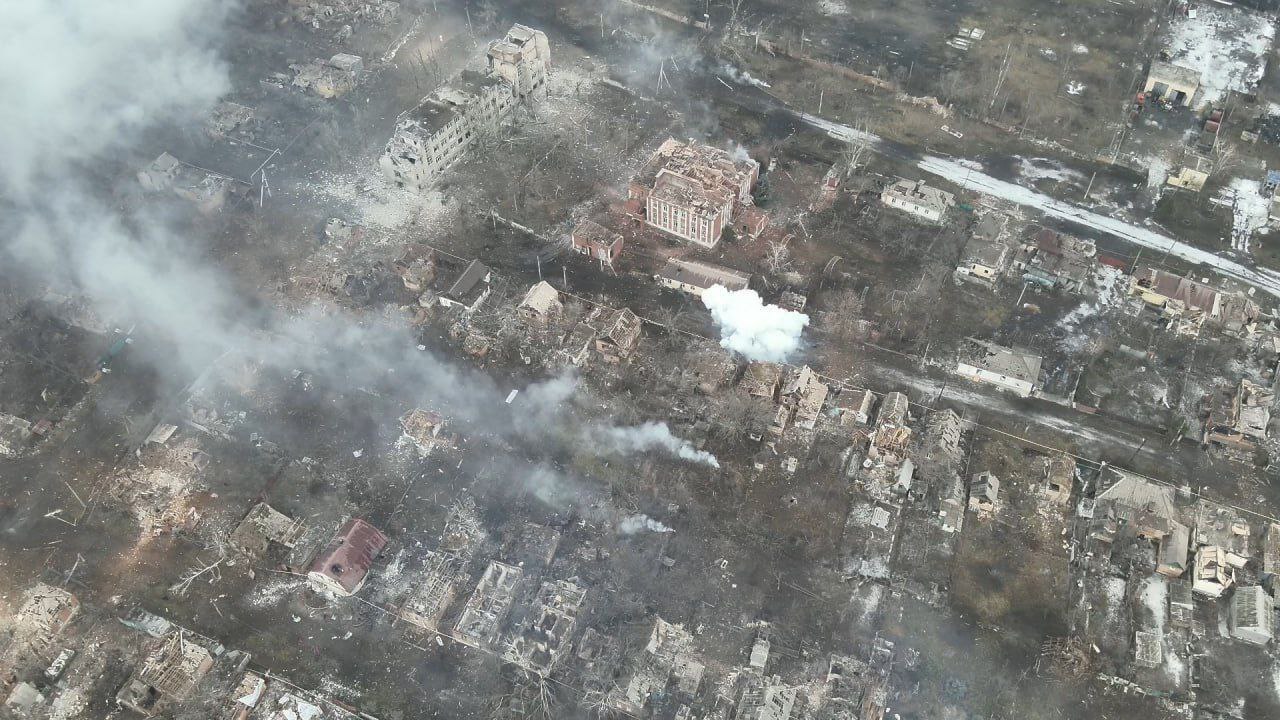 20:46 Вид фронтового Бахмута с воздуха. В городе продолжаются бои.