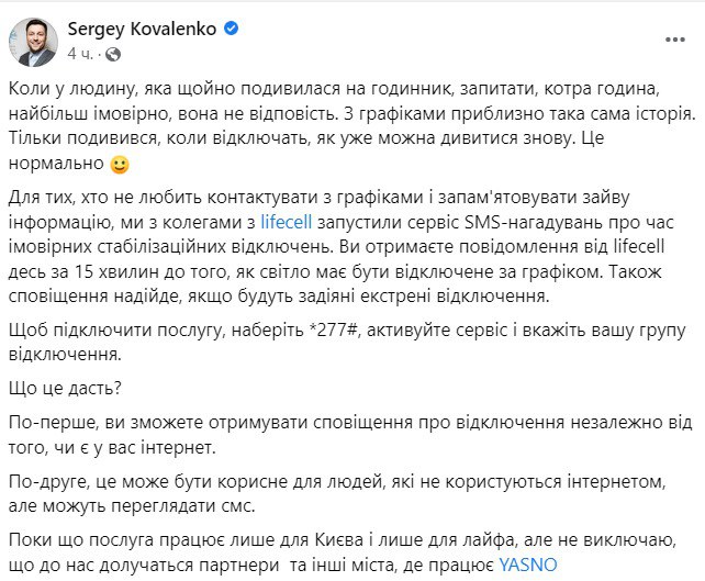 21:10 Yasno и Lifecell запустили сервис SMS-напоминаний о времени отключений света за 15 минут до того, как они произойдут.