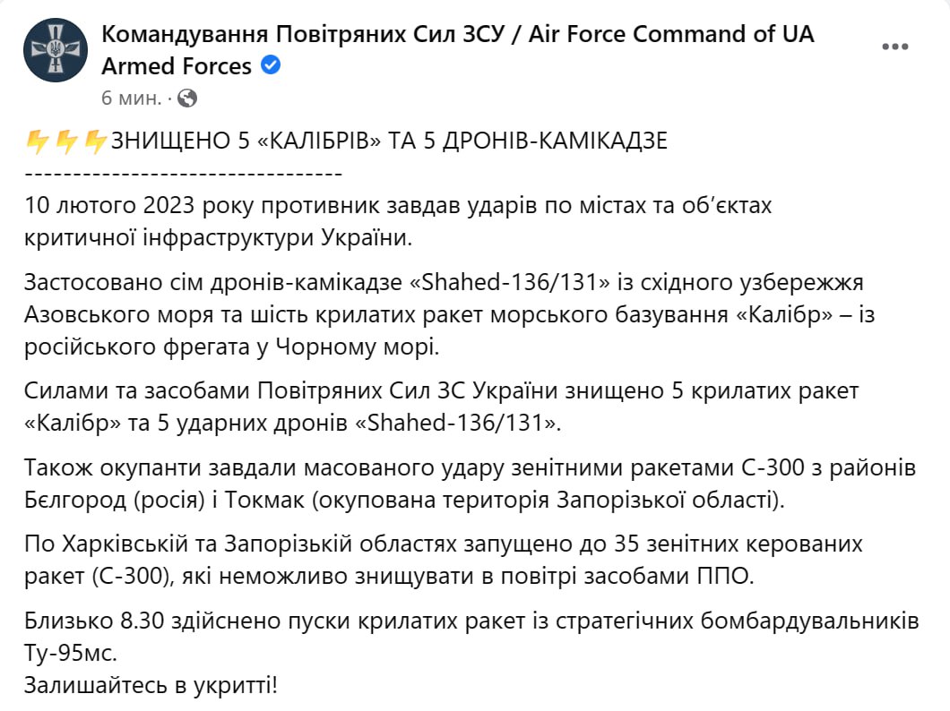 "Россияне нанесли массированный удар зенитными ракетами С-300 из Белгорода и Токмака. Запущено до 35 ракет, которые невозможно уничтожить в воздухе средствами ПВО", - говорится в сообщении.
