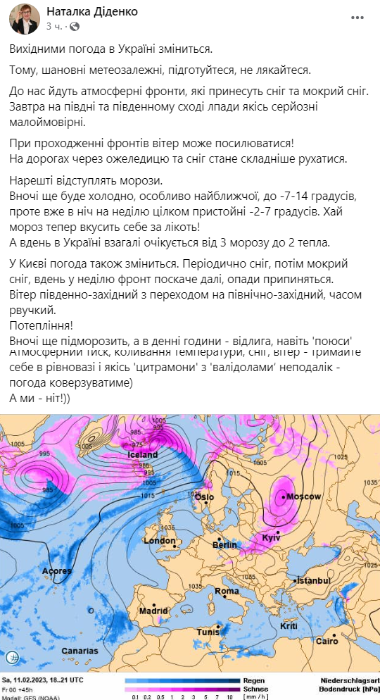 По данным синоптика Натальи Диденко, в выходные погода в Украине изменится, поскольку в Украину придут атмосферные фронты, которые принесут снег и мокрый снег.