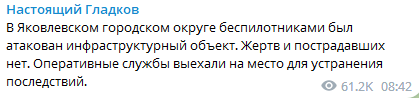 "В Яковлевском городском округе беспилотниками атаковали инфраструктурный объект. Жертв и пострадавших нет. Оперативные службы выехали на место для устранения последствий", - отметил он.