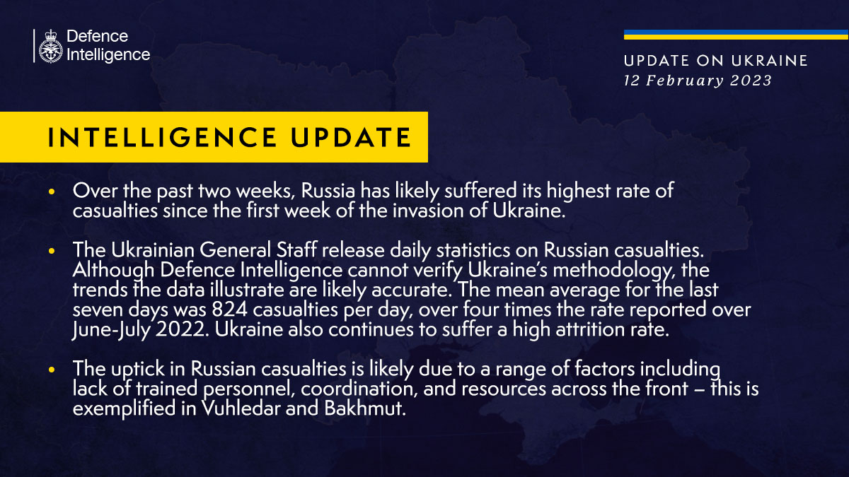 Среднее значение за последние семь дней составляло 824 человека в день, что более чем в четыре раза превышает показатель, зарегистрированный в июне-июле 2022 года. Правда, Украина также продолжает страдать от высокого уровня потерь, признает британская разведка.