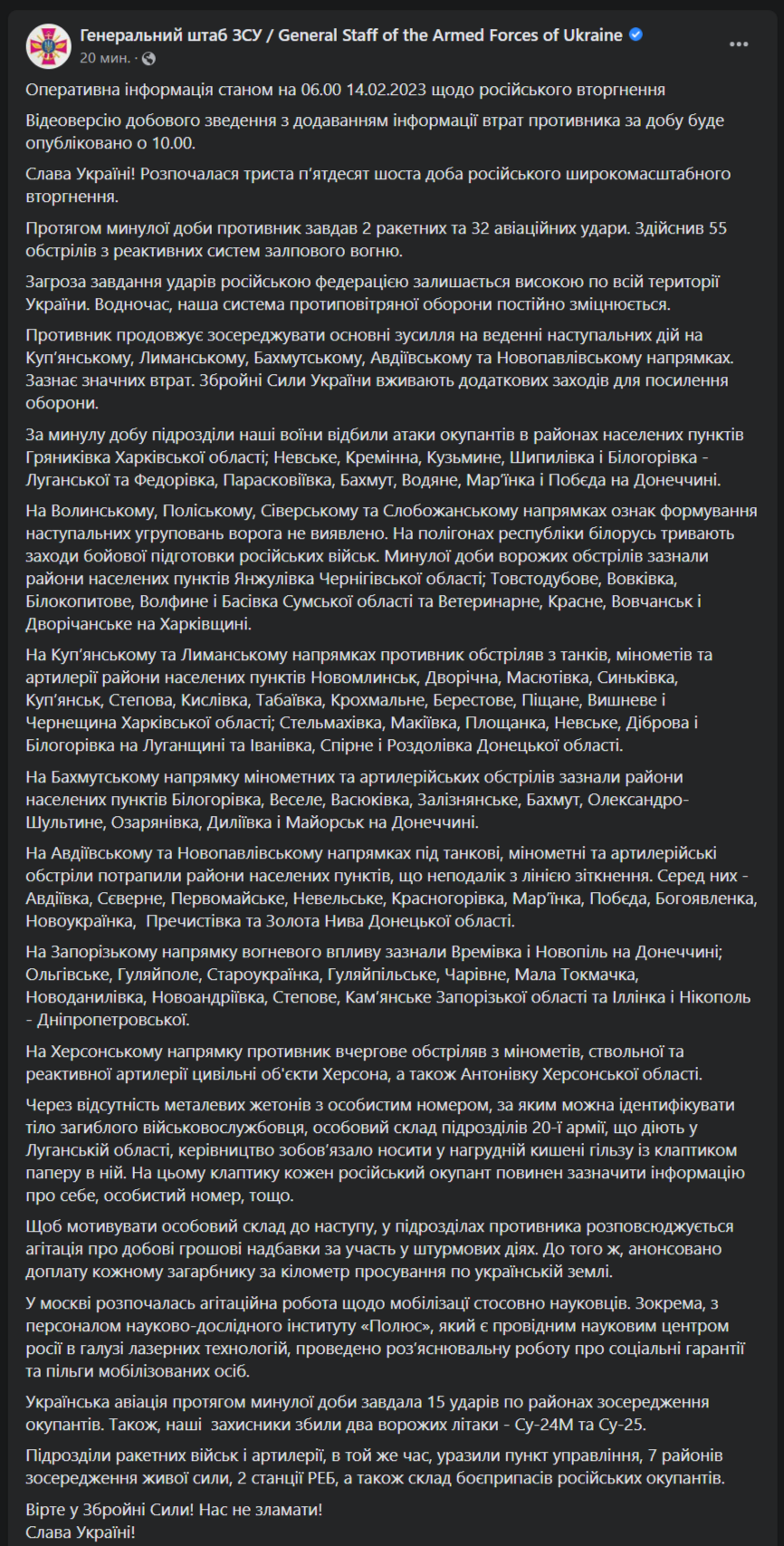 06:30 Сводка украинского Генштаба на утро 14 февраля. Главное: