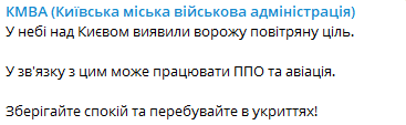 По данным Киевской городской военной администрации, в небе над Киевом обнаружили вражескую воздушную цель. В связи с этим может работать ПВО и авиация.